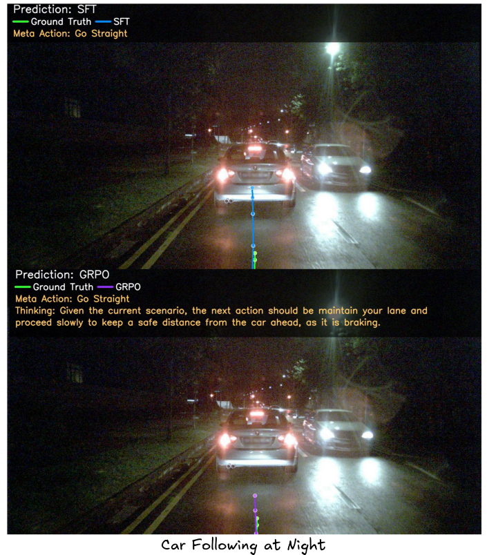在解决了开放式知识学习的奖励函数难题后,我们进一步将强化学习同时应用于驾驶知识推理与轨迹规划,实现两类任务的协同训练,模型在学习“如何思考驾驶知识”的同时,也学习“如何利用这些知识进行更合理、更安全的轨迹规划”。