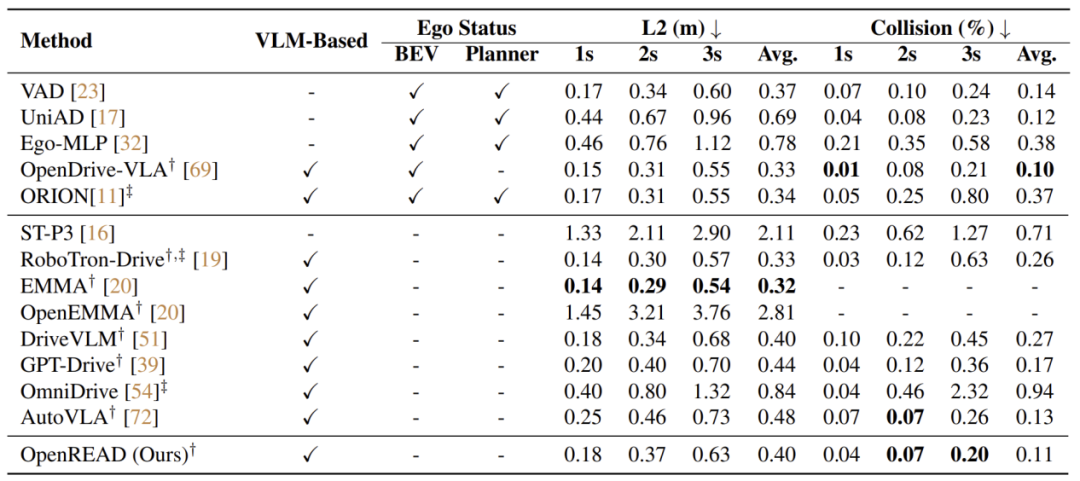 在与其他现有方法的轨迹规划对比中,OpenREAD取得了更为出色的碰撞控制能力,保证了驾驶的安全性。与同样使用GRPO进行强化学习微调的AutoVLA相比,OpenREAD均取得了更为出色的轨迹误差和碰撞率控制,这一差异也进一步说明引入驾驶知识对下游任务的重要意义。