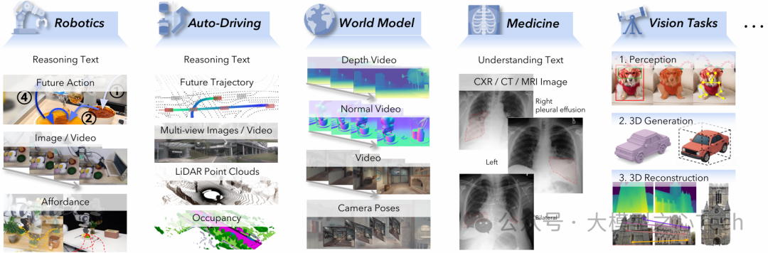 技术最终要落地到场景,综述专门用一章梳理了UFM在五大领域的应用,每个场景都有具体的技术方案,完全贴合原文描述: