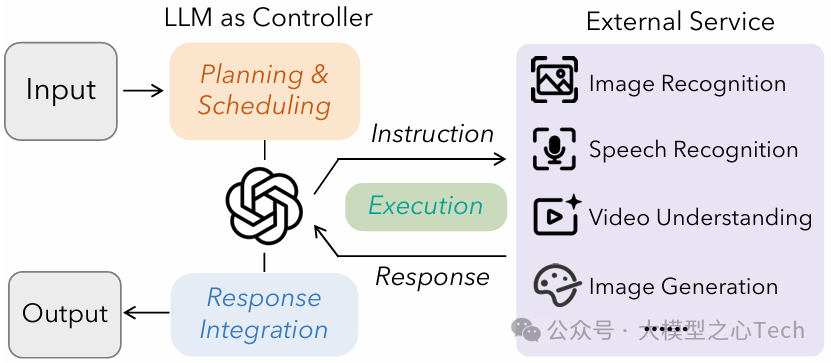 核心逻辑:LLM接收用户指令(比如“分析这张X光片并生成报告”),先拆解任务(第一步:X光片识别(调用医学图像模型);第二步:生成报告(调用文本生成模型)),再用自然语言指令调用对应外部模型,最后整合结果输出。