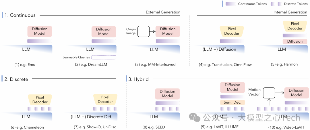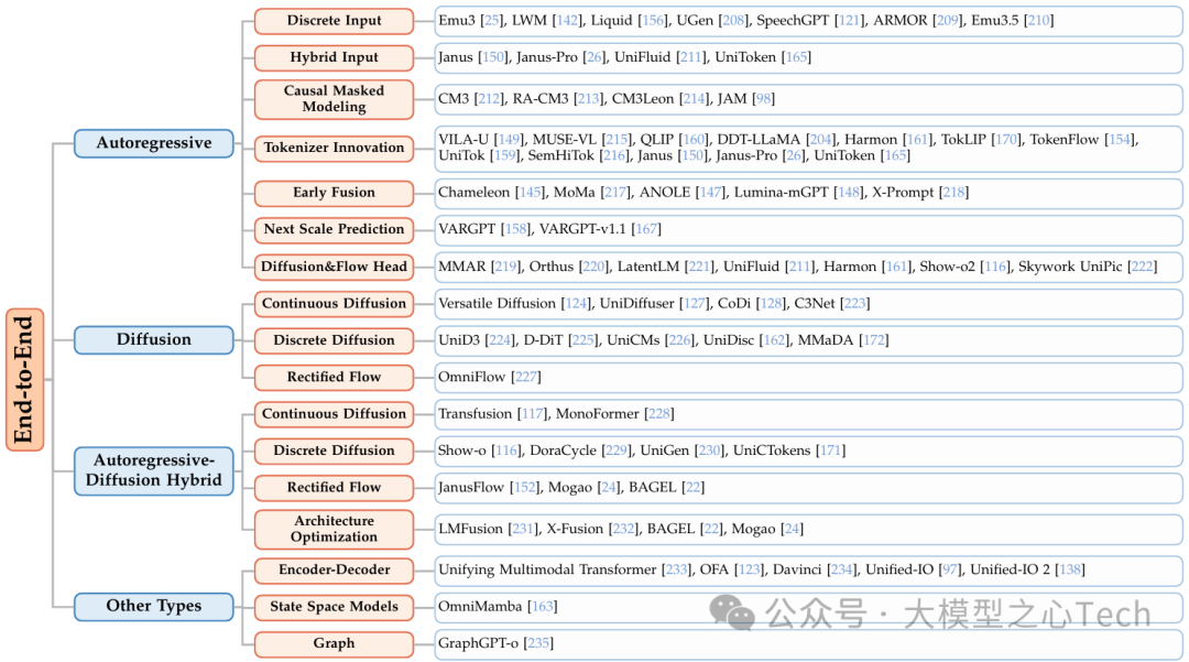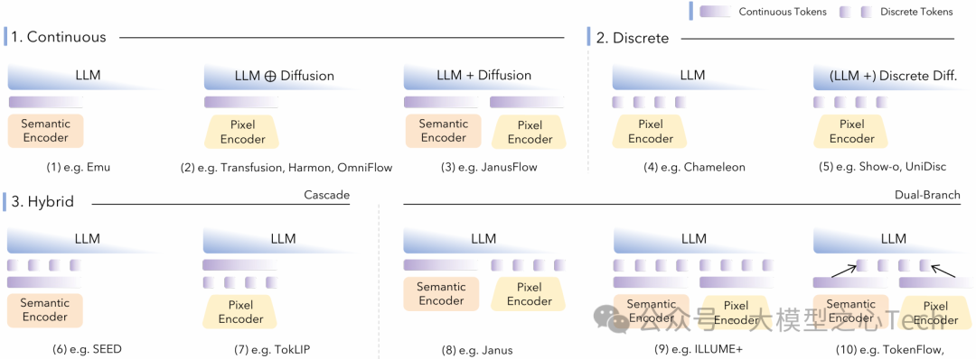 这是最“硬核”的统一方式:模型在一个架构内同时处理理解和生成任务,不用依赖任何外部模块,也是目前研究的主流方向。综述根据生成机制,又把它分为三类: