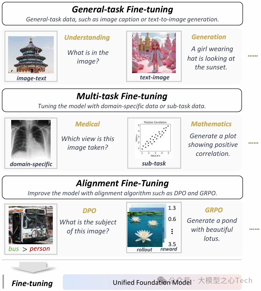 微调:分“任务监督微调”和“对齐微调”。任务监督微调又分通用任务(如图像caption、VQA)和多任务(如医学图像分析、机器人视觉导航);对齐微调则基于人类偏好——比如用DPO(直接偏好优化)让模型输出更符合人类审美,用GRPO(分组相对策略优化)减少训练成本,Emu3就用DPO微调,显著提升了生成质量。