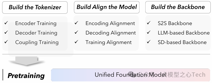 预训练:核心是“搭建三大模块+优化多任务目标”。三大模块包括编码器-解码器(处理模态转化)、对齐模块(让多模态特征在同一空间对齐)、骨干网络(LLM或扩散模型);训练目标则根据架构调整——自回归模型用next-token预测损失,扩散模型用降噪损失,混合模型则加权融合两种损失。