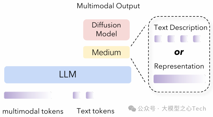 提示介导(Prompt-Mediated):LLM生成自然语言提示,引导外部生成模型工作。比如让LLM根据用户需求生成“生成'宇航员在火星表面'的图像,背景要有红色沙丘和远处的地球”,再把这个提示传给Stable Diffusion。代表模型有EasyGen(连接BiDiffuser和LLM,支持文本-图像双向生成)、GPT4Video(用LLM生成视频描述,调用视频生成模型)。