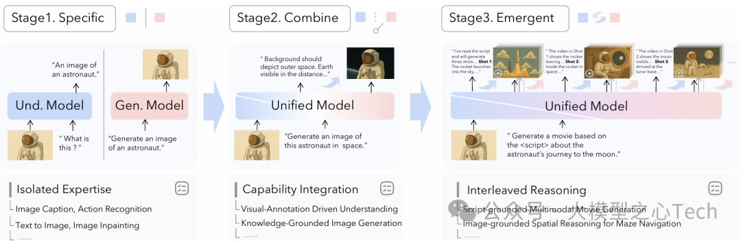 综述最有意思的部分,是把UFM的演进划分为三个清晰的阶段,每个阶段对应不同的能力边界,甚至配了直观的任务案例,我们结合原文内容拆解如下: