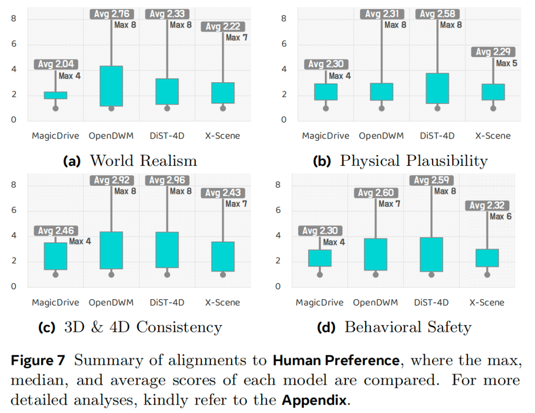 主观评估:由于定量指标无法捕捉世界建模的所有方面,我们针对世界真实感、物理合理性、3D与4D一致性及行为安全性开展了人类评估。如图7所示,所有模型的整体得分均较为温和(10分制中的2到3分),表明当前世界模型与人类级真实感仍有较大差距。DiST-4D在所有维度上的得分最为均衡,在物理合理性(2.58分)和行为安全性(2.59分)上领先;OpenDWM的真实感得分最高(2.76分),但物理一致性略低;MagicDrive的整体排名最低,反映其连贯性较差。值得注意的是,世界真实感与一致性得分高度相关,表明人类感知的真实感与几何及时间稳定性紧密耦合。综上,这些结果凸显了人类参与评估的必要性——它能补充定量基准的不足,为世界模型质量提供全面评估。