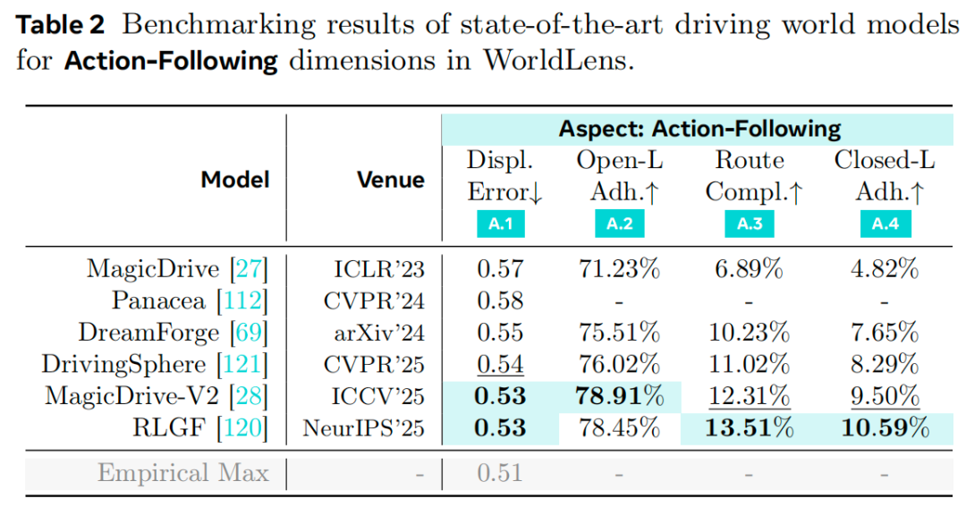 指令跟随:测试预训练动作规划器能否在生成世界中安全运行。高开环真实感并不意味着闭环控制的安全性,几乎所有现有世界模型都会导致碰撞或偏离车道等问题,说明仅靠 photometric真实感无法实现功能可靠性。
