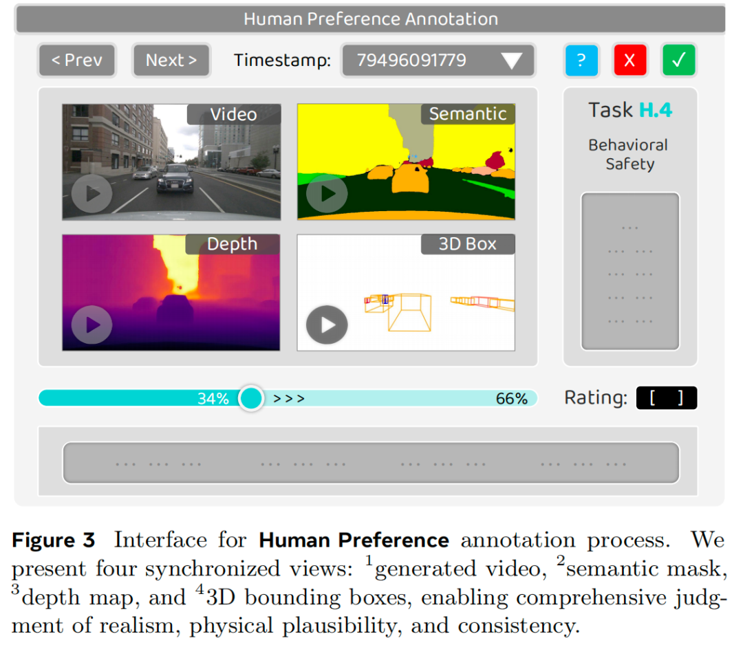 为给基准建立可靠的人类监督,我们设计了结构化多阶段标注流程。10名标注员分为两组,独立对3.5节定义的四个维度进行全视频评分;当两组评分存在分歧时,重新评估样本以确保一致性。标注界面同步展示四个视图:生成视频、语义掩码、深度图与3D边界框(如图3所示)。所有标注员均获得含评分等级示例的详细文档,以提升一致性与领域理解。平均每条标注耗时约2分8秒,总耗时超930小时。更多实现细节、文档与示例见附录。