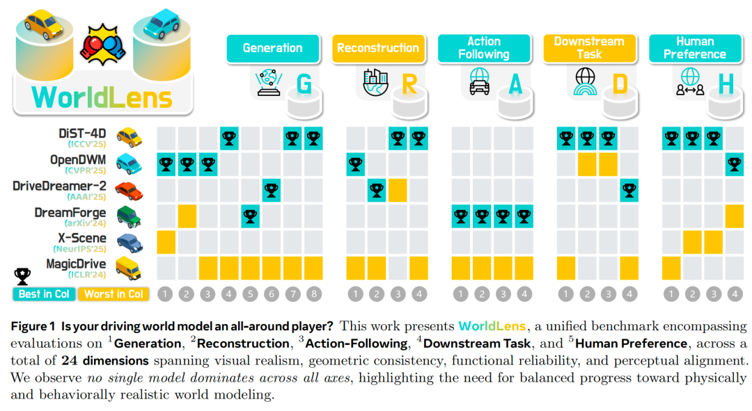 为填补这一空白,我们构建了WorldLens——全方位基准,用于评估世界模型构建、理解其生成世界并在其中行为的能力。如图1所示,现有模型均无法实现全维度最优:部分模型实现了出色的纹理真实感但违背物理规律,而另一些模型虽能保持几何一致性,却在行为表现上存在缺陷。