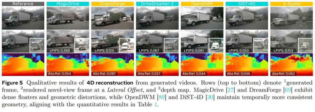 重建性能:我们通过将生成视频重建为4D高斯场来评估时空3D连贯性,其中“漂浮物”和几何不稳定性直接反映时间不一致性。如表1所示,MagicDrive的重建性能最差,其光度误差和几何差异度均比OpenDWM高出两倍以上。DreamForge也存在类似缺陷,表明其3D一致性有限。相比之下,OpenDWM和DiST-4D的重建效果显著更优,将光度误差和几何误差降低了约55%,生成的序列结构更连贯。DiST-4D的新视角质量表现最佳,这可能得益于其RGB-D生成设计,能更好地长期保留深度信息。如图5所示,MagicDrive和DreamForge在侧视视角下会产生大量漂浮物和畸变,而OpenDWM和DiST-4D则能保持清晰、稳定的几何结构。综上,时间稳定性和几何一致性是生成物理真实、可重建世界模型的关键要素。