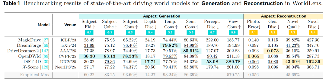 生成质量:如表1所示,所有现有模型的表现均显著低于“经验最大值”,表明驾驶世界模型的视觉与时间真实感仍有巨大提升空间。尽管DiST-4D实现了最低的感知差异度,但在目标保真度和跨视角一致性上不如OpenDWM,这表明仅靠感知指标不足以评估物理连贯的场景生成能力。OpenDWM的整体表现最为均衡,这很大程度上得益于大规模多数据集训练;而MagicDrive、X-Scene等单数据集模型在所有指标上的泛化能力有限。值得注意的是,DiST-4D、DriveDreamer-2等基于条件输入的方法通过利用真实帧,将深度一致性和跨视角一致性提升了20%-30%,部分克服了上述局限性。这些结果表明,对于实现可靠、时间一致的世界建模,数据集多样性和条件输入策略比感知保真度更为关键。