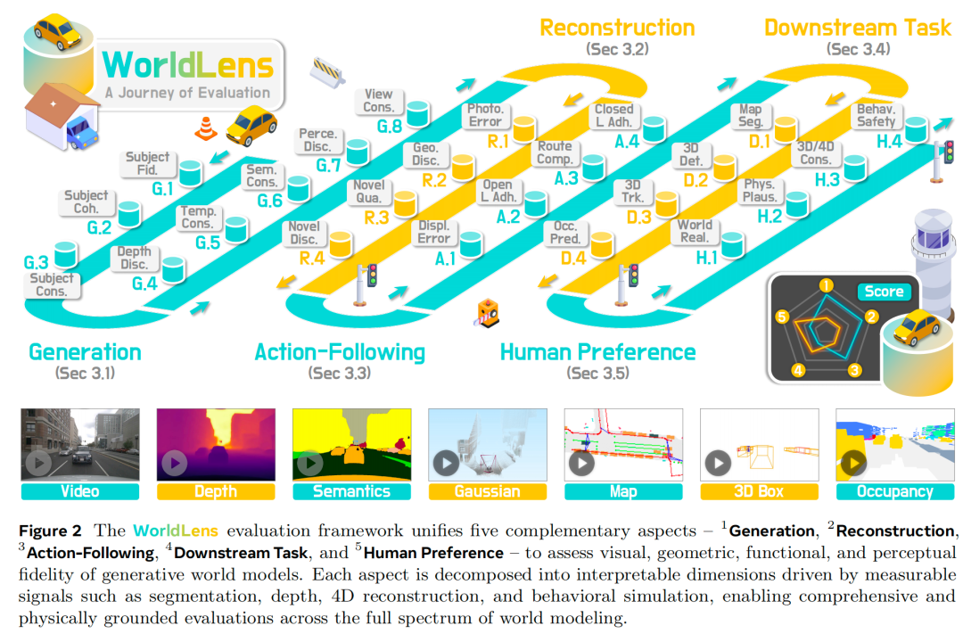 我们提出了WorldLens——一款全方位基准,从感知、几何、功能和人类对齐四个视角评估生成式世界模型。通过五个互补评估维度和二十余项标准化指标,该基准提供了衡量物理真实感与感知真实感的统一协议。结合WorldLens-26K数据集和WorldLens-Agent智能评估器,我们的框架为未来世界模型基准测试建立了可扩展、可解释的基础——引导研究向“不仅看起来真实,更能表现得合理”的系统迈进。