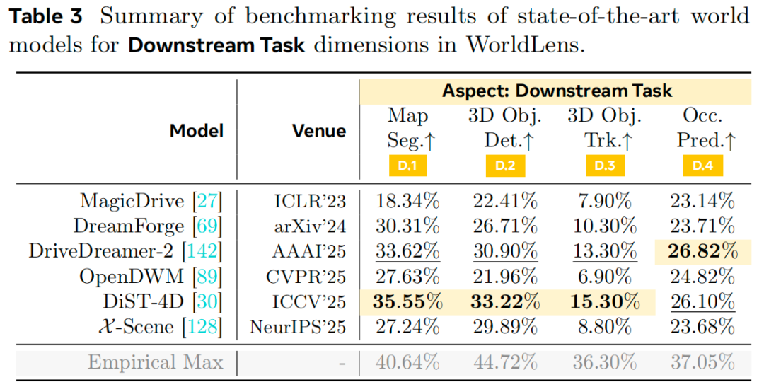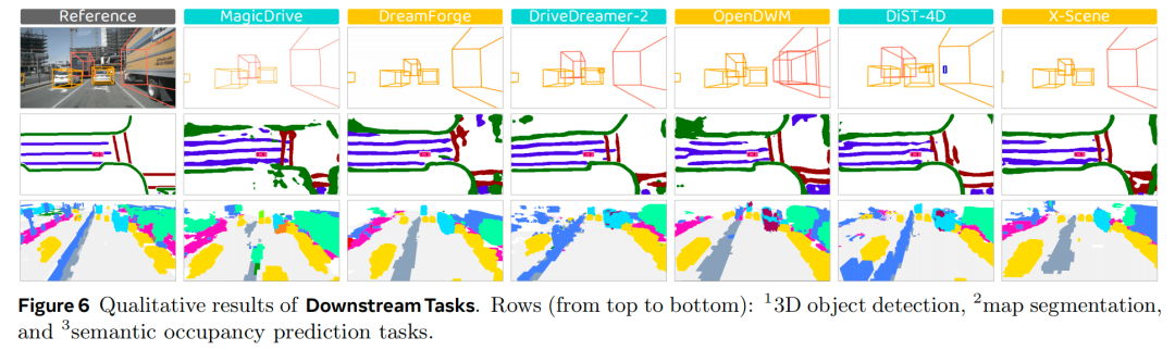 下游任务适配性:该维度直接反映世界模型超越视觉真实感的实际效用。如表3和图1所示,DiST-4D在所有任务(地图分割、3D检测、跟踪)中均大幅领先,平均比第二名模型高出30%-40%。DriveDreamer-2排名第二,尤其在占用预测任务中表现突出,彰显了时间条件输入对连贯视频生成的优势。相比之下,MagicDrive在所有任务中表现最差,证实其时空连贯性有限。有趣的是,尽管OpenDWM的感知质量出色,但在检测(21.9%)和跟踪(6.9%)任务中表现不佳,这表明大规模多域训练可能会阻碍模型对特定数据集分布的适配。图6的定性评估进一步验证了上述观察。综上,时间条件输入和数据集对齐对于提升实际应用中的任务特异性效果至关重要。