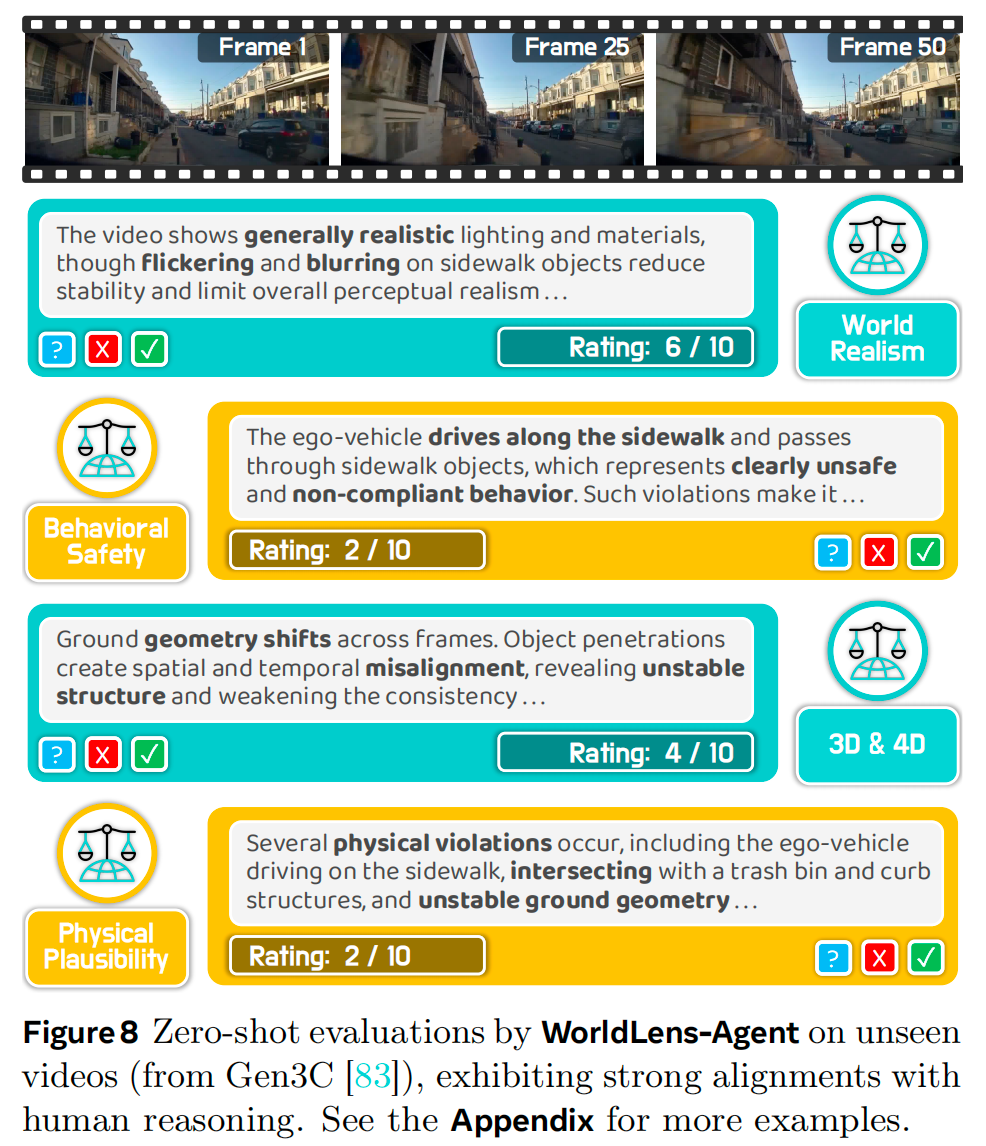 基于上述资源,我们开发了WorldLens-Agent——从人类偏好中蒸馏得到的反馈对齐自动评估器。该智能体能够预测感知和物理相关评分,同时生成与人类推理逻辑一致的自然语言说明。它对未见过的模型具有良好的泛化能力,无需重复人工标注即可实现生成世界的可扩展自动评估。