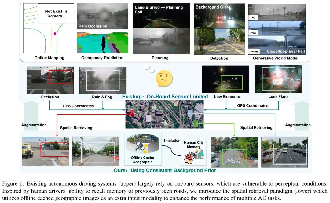 现有自动驾驶系统非常依赖车载传感器进行实时精确的环境感知。然而,这种模式受行驶过程中的感知范围限制,在视野受限、遮挡或黑暗、降雨等极端条件下常出现性能失效。相比之下,人类驾驶员即使在能见度不佳的情况下,仍能回忆起道路结构。为了让模型具备这种“回忆”能力,针对这个特点,复旦可信具身智能和上交等合作,将离线检索的地理图像作为额外输入引入系统。这些图像可从离线缓存(如谷歌地图或已存储的自动驾驶数据集)中轻松获取,无需额外传感器,是现有自动驾驶任务的即插即用型扩展方案。