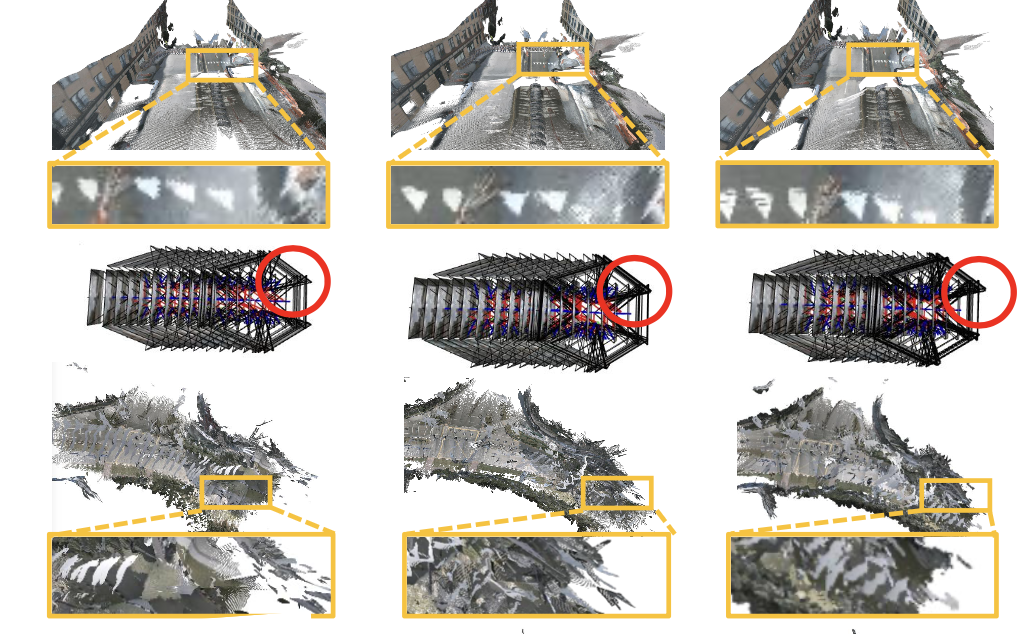 为了量化所提方法的综合性能,我们比较了 VGGT、fastVGGT 和 DriveVGGT 的可视化结果。为了生成最终的点云,我们在图像外参的指导下将深度图投影到全局点。 我们可视化了交通场景中 3 种典型车辆运动状态的重建结果和相机位姿输出。我们使用 30×6 张图像作为模型输入。
