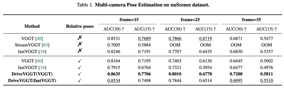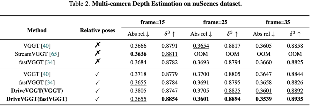 深度估计的比较如表 2 所示。作为对相机位姿估计的评估,我们在 nuScenes 数据集上测试了 VGGT、StreamVGGT、fastVGGT 和 DriveVGGT。在 Abs Rel 指标上,DriveVGGT(fastVGGT) 在 35 帧场景中取得了最佳的深度估计性能,这表明其处理长序列多相机视频的能力。StreamVGGT 在 15 帧场景中优于其他方法。