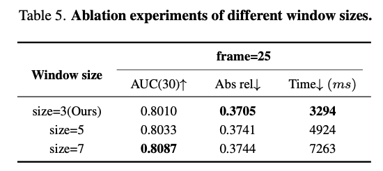 为了全面评估窗口注意力的功能,我们在表 5 中测试了 3 种窗口大小。与大小为 5 和 7 相比,大小为 3 可以在性能和效率之间保持平衡。