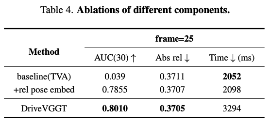 为了验证所提组件的有效性,我们通过从 DriveVGGT 中移除所提模块进行了消融研究,详细评估见表 4。基线模块仅使用 TVA 模块来实现视频中图像之间的注意力。测试结果表明,由于缺乏相对位姿表示,基线无法处理多相机系统。添加相对位姿嵌入后,模型可以输出多相机系统的正确位姿预测。