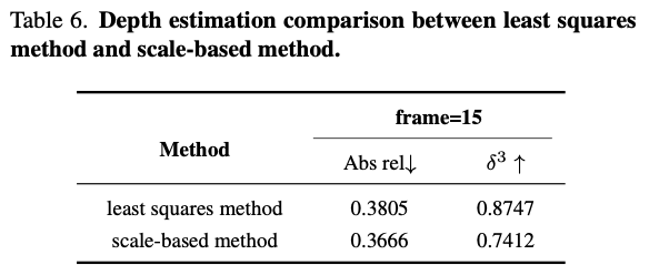 为了评估尺度头的有效性,我们使用两种对齐方法(最小二乘法和基于尺度的方法)将深度预测结果与真实值进行比较。结果如表 6 所示。结果表明,尺度预测可以将深度转换为真实世界尺度。随后,我们可视化了真实尺度的点云和相机外参。结果表明,真实尺度的点云保持了与归一化点云相似的几何一致性。