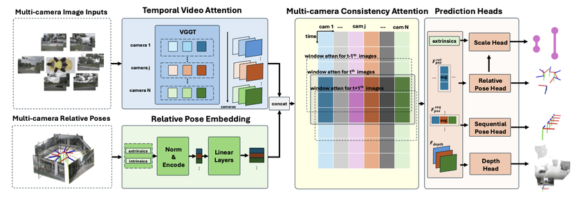 为了在多相机系统中充分聚合相机相对位姿,我们提出了一种带有相对位姿的多相机视觉几何变换器,以实现相对位姿与来自 VGGT 的几何标记之间的有效融合。该模型包含两个部分。首先,提出了时序视频注意力模块,用于在所有摄像头之间实现摄像头级别的几何聚合。由于每个摄像头的视频具有时序连续性,VGGT 可以有效地将单摄像头视频处理成几何标记。每个图像的几何标记由图像位姿标记和深度标记组成,将分别用于预测图像位姿和深度。