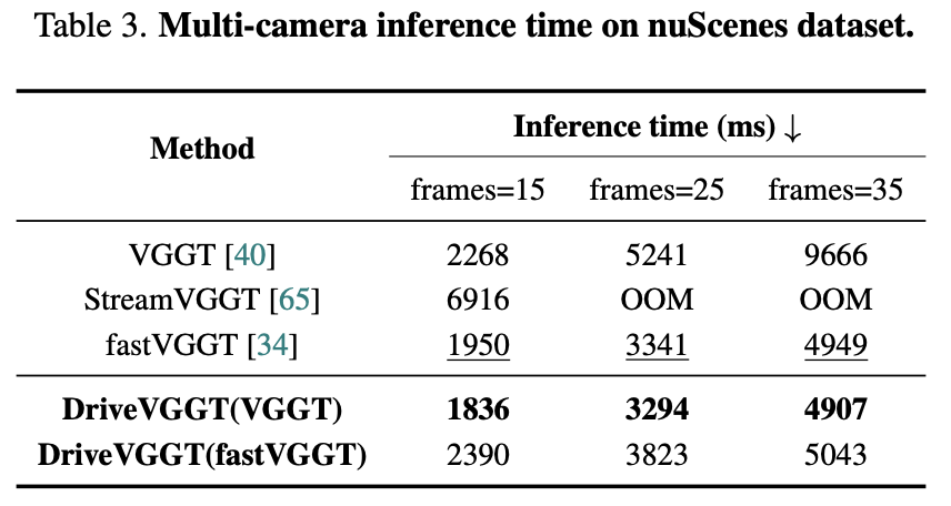 推理时间的比较如表 3 所示。总体而言,与 VGGT 和 fastVGGT 相比,所提方法实现了更快的推理速度。DriveVGGT(VGGT) 在 35 帧场景中的推理时间仅为 VGGT 的 50%。同时,DriveVGGT(fastVGGT) 的速度低于 DriveVGGT(VGGT),这是由于 fastVGGT 中额外的标记聚合算法导致在处理较少图像时推理时间延迟。