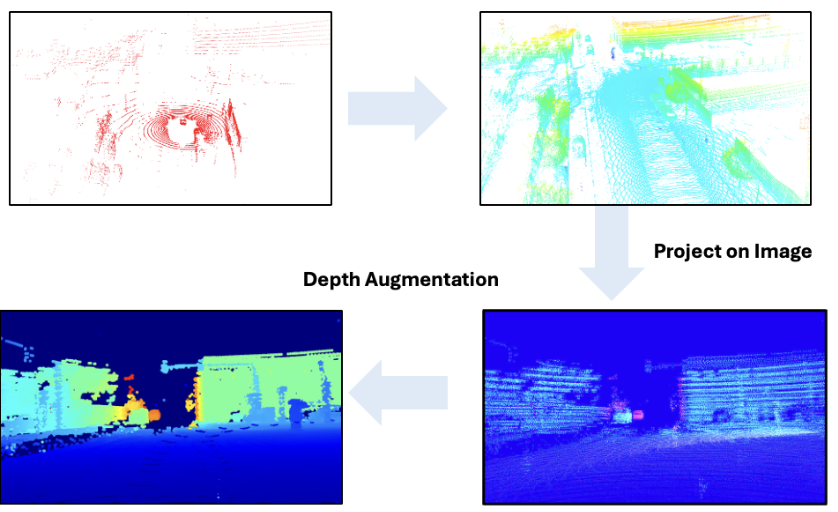 其次,将点云投影到深度图上后,我们利用深度增强算法来提高深度图的有效性。