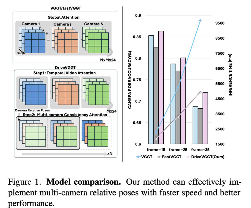 在 nuScenes 数据集上进行的大量实验表明,我们提出的 DriveVGGT 具有优越性,其在推理速度和预测精度上均优于其他基于 VGGT 的方法。