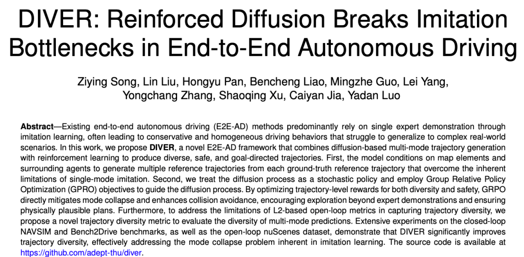 近日,来自北京交通大学、地平线机器人、华中科技大学、清华大学、澳门大学、昆士兰大学等机构的研究团队提出了一种面向端到端自动驾驶的多模态规划框架 DIVER(Diffusion + Reinforcement for Diverse End-to-End Driving)。该方法将扩散模型的多模态生成能力与强化学习的目标约束机制相结合,将轨迹生成从“单一模仿回归问题”转化为“在安全与多样性约束下的策略生成问题”,从而能够在统一模型中生成多样、可行且符合驾驶语义的候选轨迹。