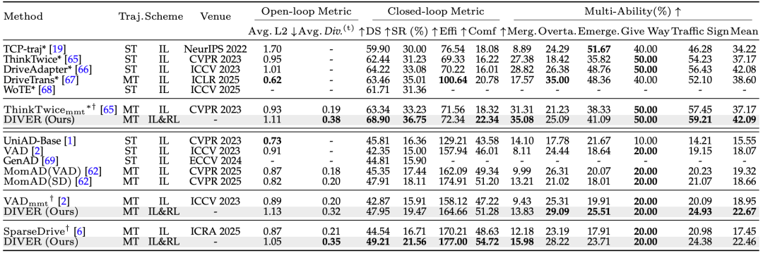 在 Bench2Drive 闭环评测中,DIVER 在多项关键指标上显著优于 UniAD、VAD、SparseDrive、DiffusionDrive 等方法(表1)