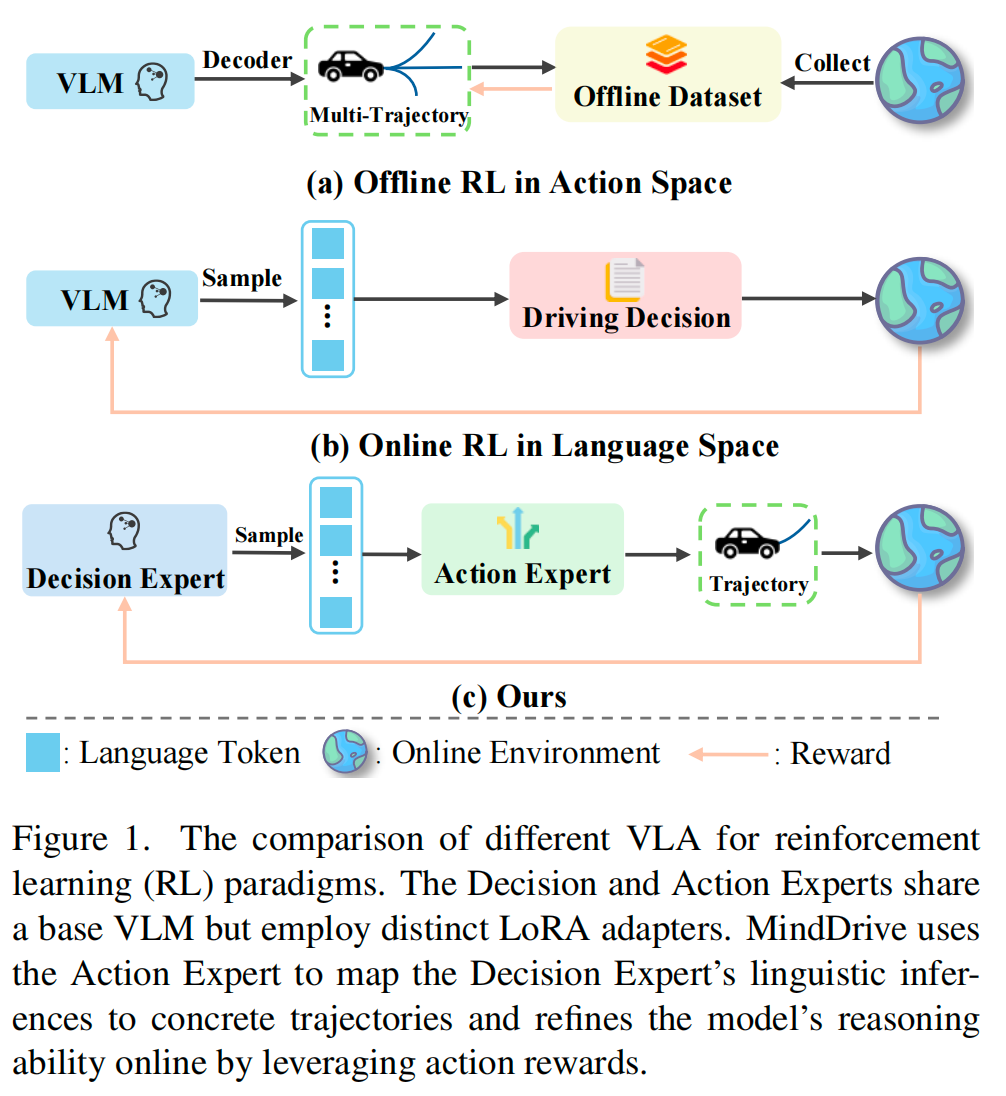 与视觉语言模型离散语言空间中的强化学习不同,自动驾驶的动作空间是连续的轨迹空间。当前强化学习在自动驾驶视觉-语言-动作领域的应用主要分为两类范式:动作空间的离线强化学习和语言空间的在线强化学习。离线强化学习通常基于专家演示构建的固定数据集进行训练,如图1(a)所示。这些方法采用带有不同奖励函数的离线强化学习,在动作空间中生成更可行的轨迹。尽管取得了一定进展,但离线强化学习限制了视觉-语言-动作模型通过与环境交互进行探索的能力。此外,强化学习中对轨迹的优化无法有效提升视觉语言模型的推理能力。为克服这些限制,部分方法尝试在语言空间中应用在线强化学习,如图1(b)所示。这些方法将驾驶决策视为动作,通过在线强化学习加深对因果推理的理解,但难以将驾驶决策有效映射为具体且类人的驾驶轨迹。因此,利用在线强化学习提升自动驾驶视觉-语言-动作模型的性能仍需进一步探索。