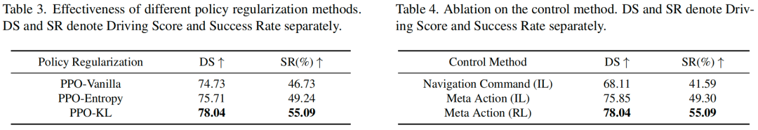 控制方法消融:我们通过对比两种高层指令方式,研究了不同控制方法的效果:导航指令和大语言模型生成的元动作。如表4所示,基于视觉语言模型引导的元动作模仿学习模型,相较于导航指令基准,驾驶得分提升7.74分,成功率提升7.71%,表明视觉语言模型衍生的元动作能支持复杂交通场景下更有效的推理;引入在线强化学习后,元动作选择进一步优化,驾驶得分额外提升2.19分,成功率额外提升5.79%。