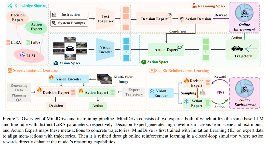 本节将详细介绍所提出的MindDrive。如图2所示,MindDrive的架构包含两个核心组件:决策专家(Decision Expert)和动作专家(Action Expert)。两者共享相同的视觉编码器(Vision Encoder)和文本分词器(Text Tokenizer),仅在各自的低秩适配(LoRA)参数上存在差异。决策专家基于导航指令和多视角视觉输入进行高层推理,以元动作(meta-actions)的形式生成抽象驾驶决策;动作专家则结合场景信息和指令,将这些元动作转化为具体的动作轨迹。该设计实现了灵活且可解释的动作生成,衔接了高层推理与低层控制。我们的训练过程分为两个阶段:1)模仿学习(IL)建立语言与动作空间的映射,为在线强化学习(RL)提供高质量候选轨迹,有效缩小其探索空间;2)在线强化学习通过在线环境中的动作奖励进一步提升模型的理解能力。
