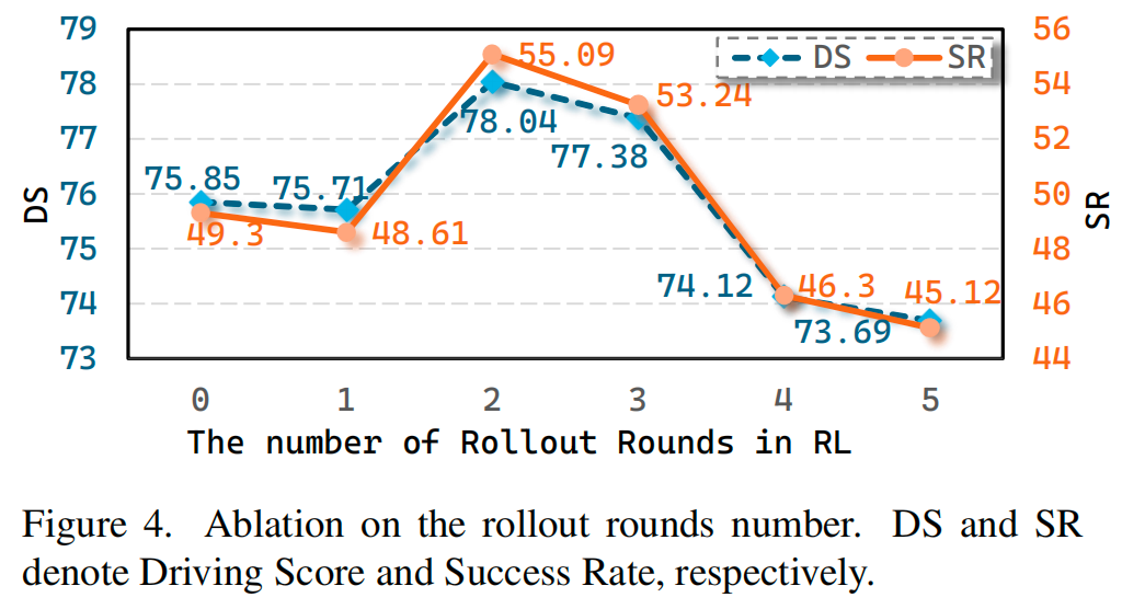 rollout次数消融:我们进一步分析了在线强化学习过程中滚动次数对MindDrive的影响。如图4所示,仅执行一次滚动时,价值网络的估计不准确导致动作优势估计出现偏差,性能较基准下降;执行两次滚动后,模型显著超越基准,驾驶得分提升2.19分,成功率提升5.79%;但继续增加滚动次数会导致性能大幅下降,驾驶得分从78.04降至73.69,成功率从55.09%降至45.12%。这一退化源于灾难性遗忘——过多滚动导致策略过拟合近期经验,忘记之前学到的场景理解能力。因此,我们将默认滚动次数设为2,以平衡探索效率和训练稳定性。