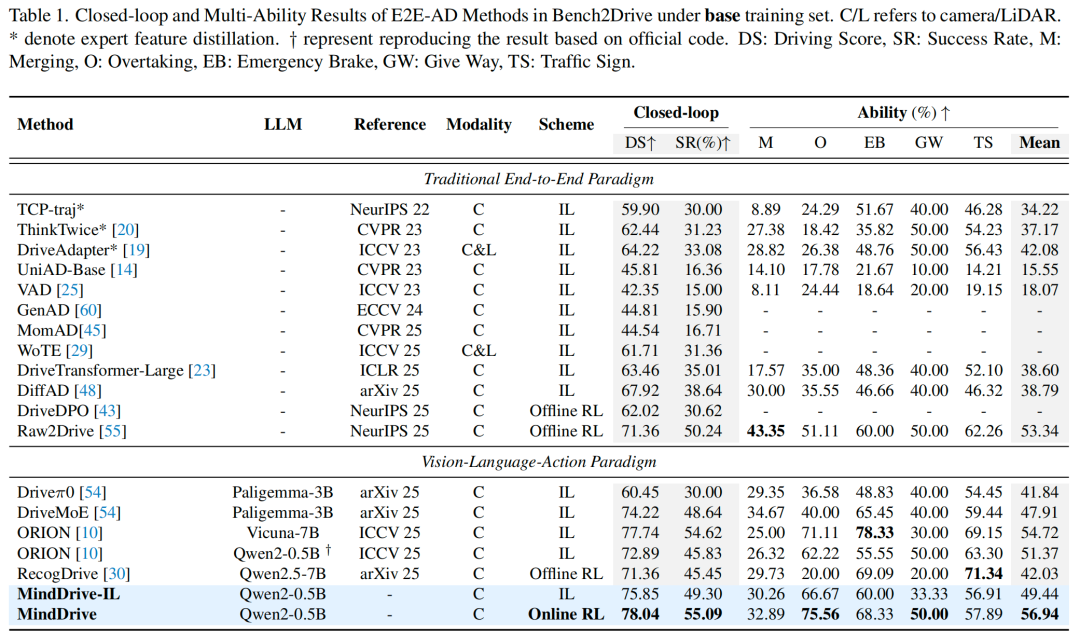 我们在Bench2Drive基准测试集上,将MindDrive与传统端到端(E2E)和视觉-语言-动作(VLA)范式的代表性方法进行了全面对比。表1列出了详细结果,主要发现如下: