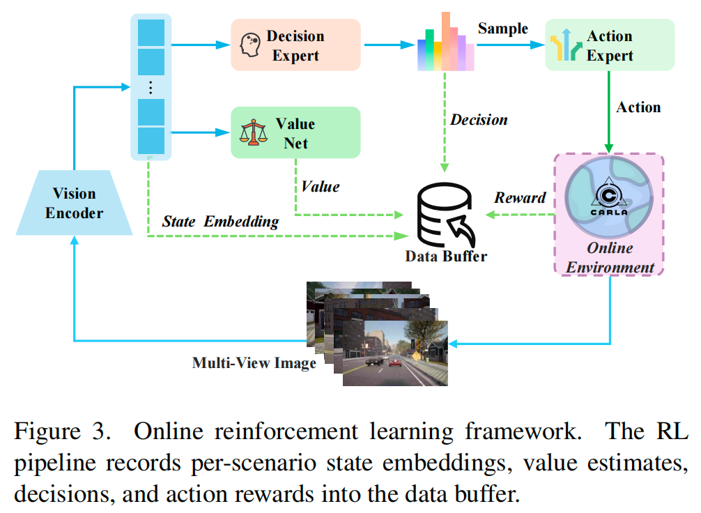 模仿学习能生成类人轨迹,但常受因果混淆问题困扰。为解决这一问题,我们在CARLA仿真器中引入在线强化学习。如图3所示,这种在线方式使智能体能通过试错探索环境,从直接交互及其后果中学习,进而提升模型在复杂场景下的驾驶性能。