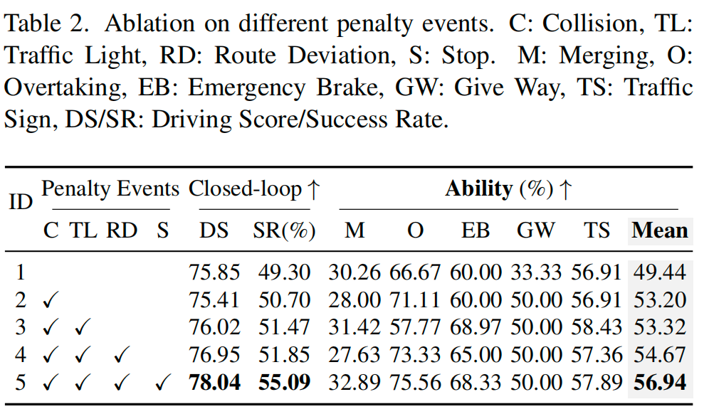 我们采用CARLA官方排行榜指标作为惩罚事件,包括与其他车辆碰撞、闯红灯等严重违规行为。一旦触发任何惩罚事件,滚动过程立即终止。收集完完整路线后,通过时序差分法计算