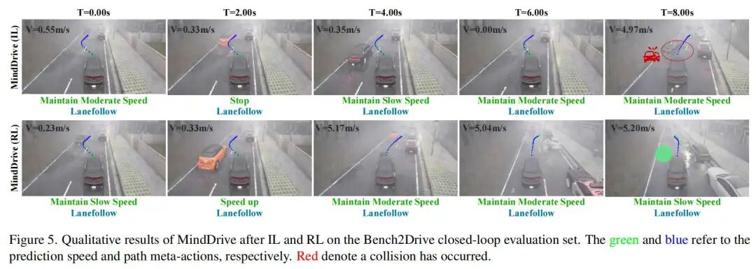 图5展示了MindDrive的模仿学习版本与强化学习版本的定性对比。模仿学习范式在特定任务上表现出较强能力(如及时发出停车指令以实现早期制动),但仅通过模仿学习训练的MindDrive在动态交互场景中表现不佳,尤其在需要复杂决策的场景(如确定最优变道时机)中。经过强化学习训练后,MindDrive在具有挑战性的场景中能选择更稳健的元动作,实现更安全、更果断的变道行为。这些定性结果表明,强化学习阶段显著提升了视觉语言模型的高层推理和决策能力,使其能更好地应对复杂且不确定的交通环境。