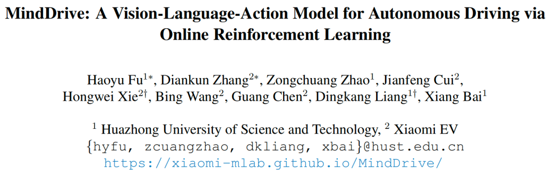 论文标题:MindDrive: A Vision-Language-Action Model for Autonomous Driving via Online Reinforcement Learning