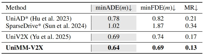 预测:UniMM-V2X 取得了最佳性能,minADE 为 0.64m,minFDE 为 0.69m,这些改进为上述最终规划性能的提升做出了重大贡献。