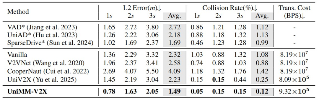 规划:UniMM-V2X 实现了最低的平均 误差(1.49m),优于包括单智能体和现有协同方法在内的所有基准模型。更重要的是,UniMM-V2X 展现了卓越的安全性,3s平均碰撞率仅为 0.12%。