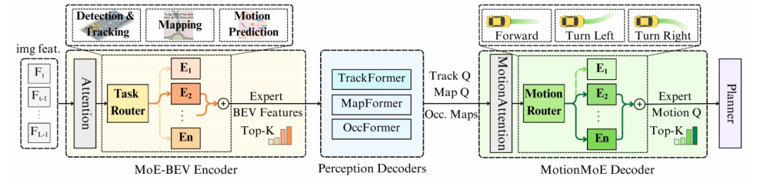 ★编码器为多样的下游任务(检测、跟踪、建图、运动预测)丰富了 BEV 特征提取过程;而解码器则通过针对特定运动的专家分支(如直行、左转、右转)生成运动查询向量,从而提升规划质量。