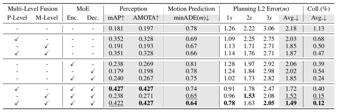 通过大量实验,验证了多级融合与 MoE 架构的结合产生了强大的互补效应,感知准确度提升了39.7%,预测误差降低了7.2%,规划性能提升了33.2%,充分展示了MoE 增强的多级协同范式的实力,促进了更可靠的协作,大幅提升了决策质量。