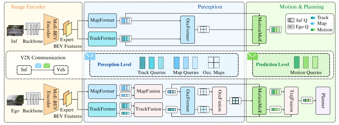 UniMM-V2X由三个主要部分组成:图像编码器、协同感知模块,以及协同预测与规划模块。图像编码器结合了 MoE 架构以提取任务自适应的 BEV 特征。感知模块负责执行协同检测、跟踪、建图以及占用图的生成。预测与规划模块通过基于 MoE 的解码器生成运动预测,并融合多智能体预测信息以做出规划决策。感知层面与预测层面的融合共同构成了一个统一的多级融合框架,使智能体能够在整个决策过程中实现有效的协作,显著提升了端到端系统在复杂多车环境下的可靠性。
