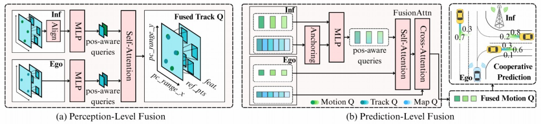 ★(a) 感知级融合通过参考点嵌入引入空间位置先验,并利用基于注意力机制的多智能体动态融合。(b) 预测级融合采用基于锚点的嵌入和动态融合,以支持复杂多智能体环境下的运动推理。