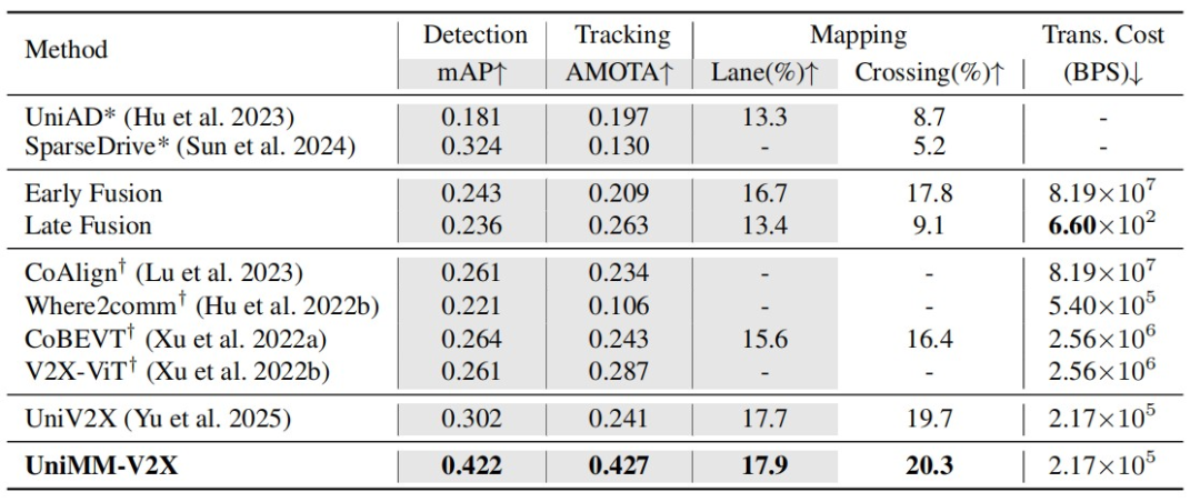 UniMM-V2X通过在感知和预测层面进行信息融合,并在 BEV 编码器和运动解码器中集成 MoE模块,实现了更安全、自适应性更高的协同自动驾驶方案。在 DAIR-V2X 基准测试上的广泛评估表明,UniMM-V2X 达到了最佳性能,其检测性能提升了 39.7%,跟踪性能提升了 77.2%,运动预测误差降低了 7.2%,L2 规划误差降低了 33.2%,碰撞率降低了 52.0%。该框架在不同带宽约束下展现出了可靠性,突显了其在现实世界协同驾驶中的实际部署潜力。尽管在通信效率与闭环验证上仍有探索空间,但 UniMM-V2X 无疑为多智能体协同驾驶的未来提供了一条清晰的技术路线。在算力与网络不断进化的今天,这种分级协作、动态适配的端到端框架,或许能够推进全场景自动驾驶未来的实现。