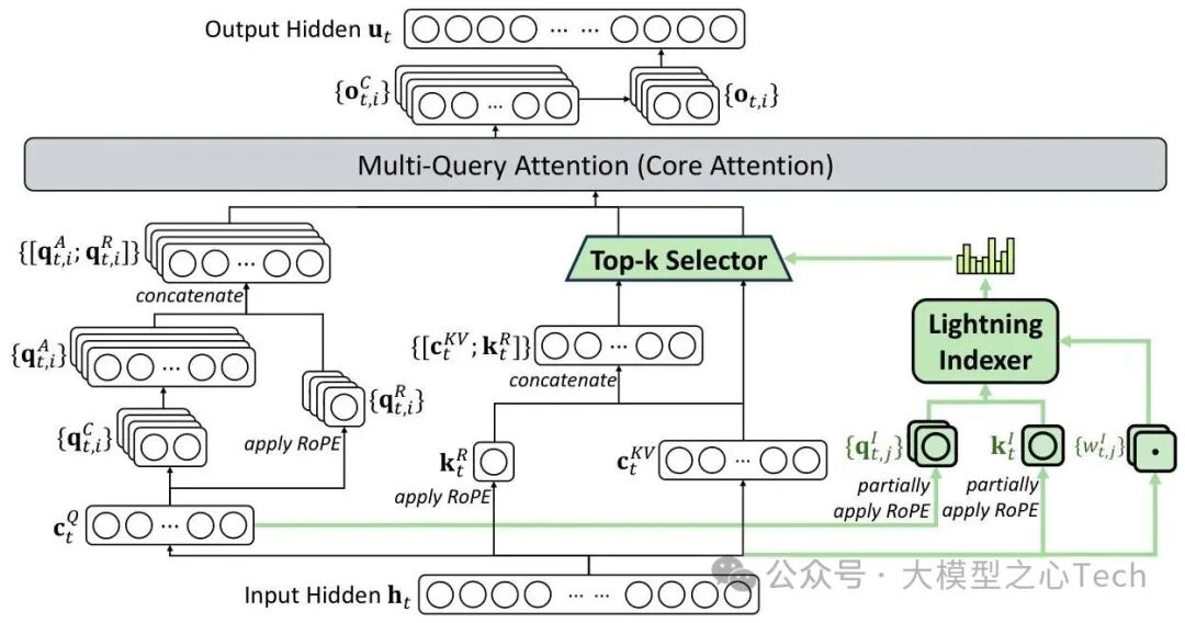 与传统稠密注意力不同,DSA通过"lightning indexer(闪电索引器)+fine-grained token selection(细粒度token选择)"的双组件设计,在保持模型性能的同时,将核心注意力计算复杂度从O(L²)降至O(Lk)(k为选中的token数,远小于序列长度L)。