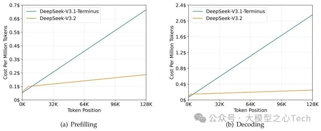 值得注意的是,DeepSeek-V3.2在保持高性能的同时,展现出优异的成本效率。通过DSA机制,模型在H800 GPU上的推理成本显著低于前代产品,长序列解码时的成本优势尤为明显,为大规模部署提供了可行性。