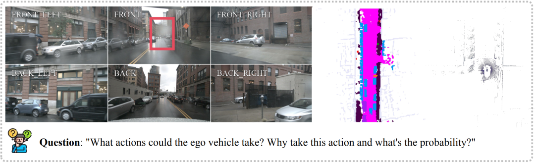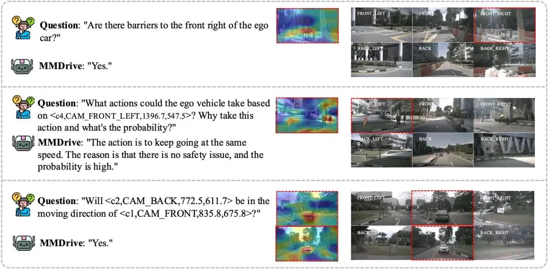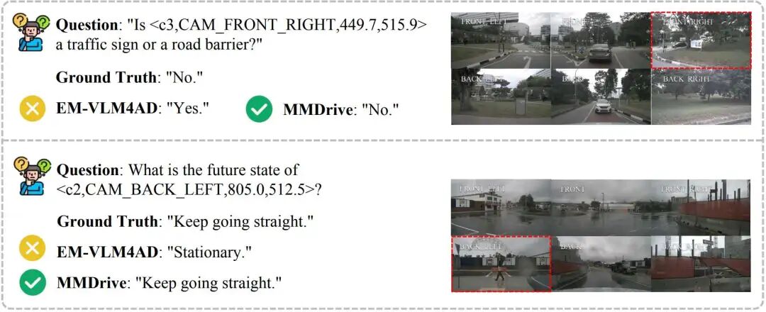 左边的面板显示问题和相应的预测,而右边的面板显示六张环绕视图图像。MMDrive可以准确地检测物体,推荐安全行为,并预测不同视点的物体细节。