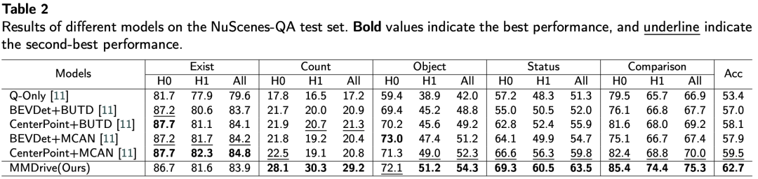 尤其在 计数、状态查询、比较类问题 上,MMDrive 优势明显,说明其在空间推理与语义理解方面更具优势。